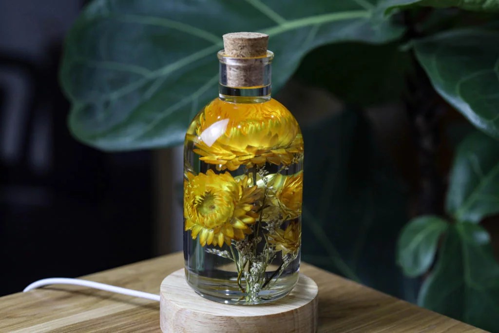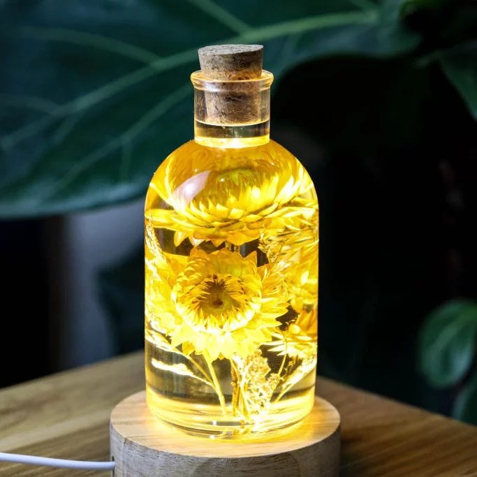 This sculpture Chrysanthemum Night light is made with actual flowers, but it will indefinitely remain within the crystal capsule forever. They don’t need sunlight or water. The chrysanthemum in the center of the epoxy wood lamp will instantly liven up and showcase any indoor space. Our artisans make sure the flowers stay vibrant for a long time, making it a great investment.
