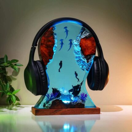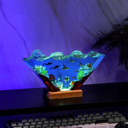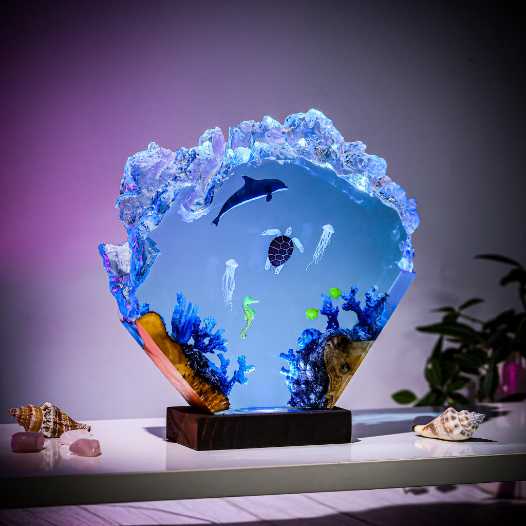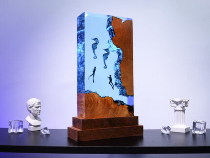 Our Deep Ocean resin lamp is fully handcrafted by the skillful hands of Epolume artisans. Not only depicting the color of the deep sea but also adorning the creatures and people who are in harmony with the water, in a rhythmic and flexible way.
