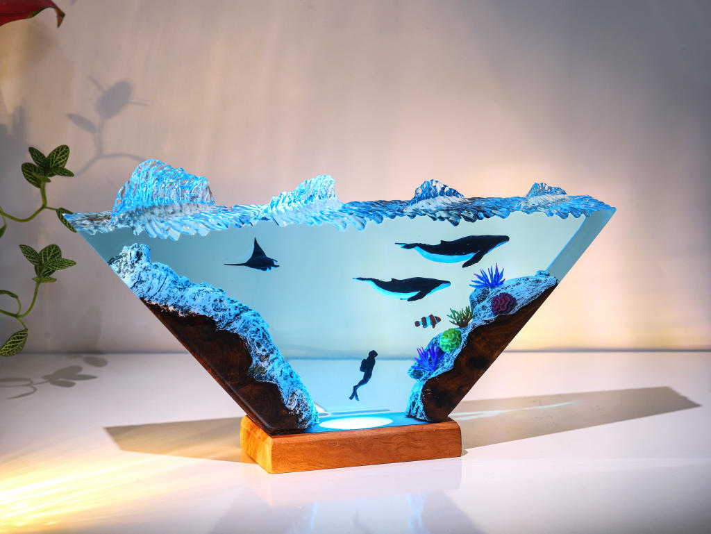 Once the time comes when you need to breathe, call on our Humpback Whale and Diver night light ver 2. Together with the magical light of the ocean, the slow movement, and the echoing sound of humpback whales, all will help you inhale in the refreshing air. Our Humpback Whale and Diver epoxy lamp ver 2 is so amazing, right? With Humpback Whale and Diver resin lamp ver 2, you will feel peace, compassion, and love all around and in your own soul. Don’t worry if you encounter something that makes you unhappy in your life, EpoLume epoxy lamps are always here to soothe your soul. Tech specs:
