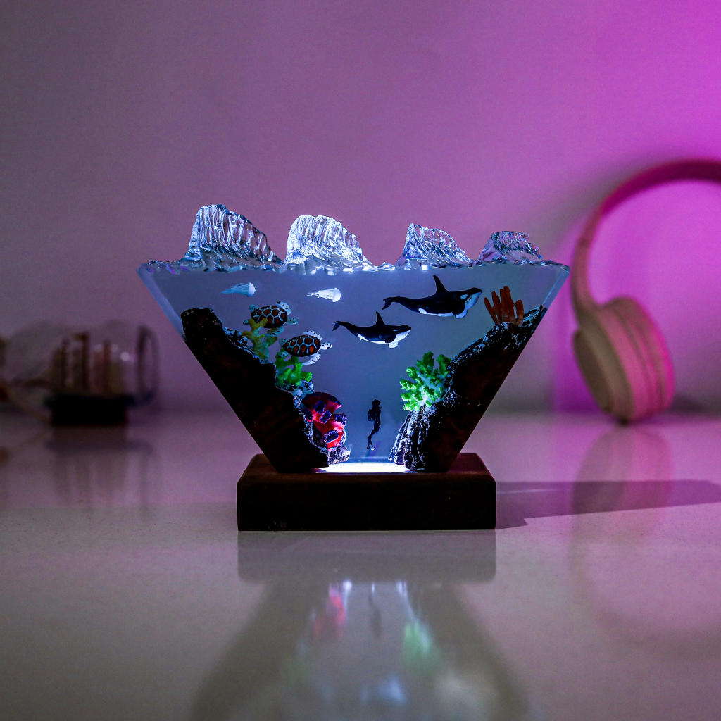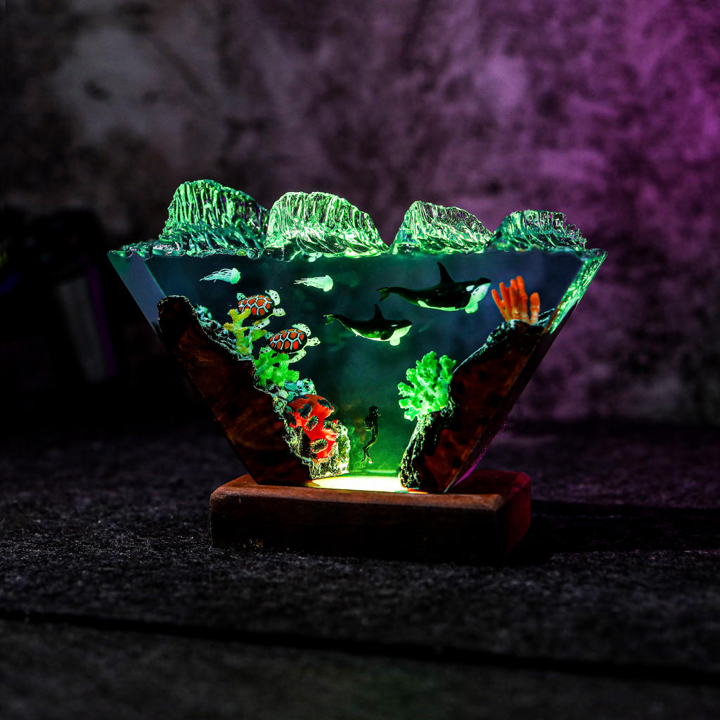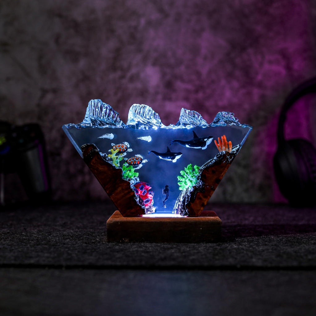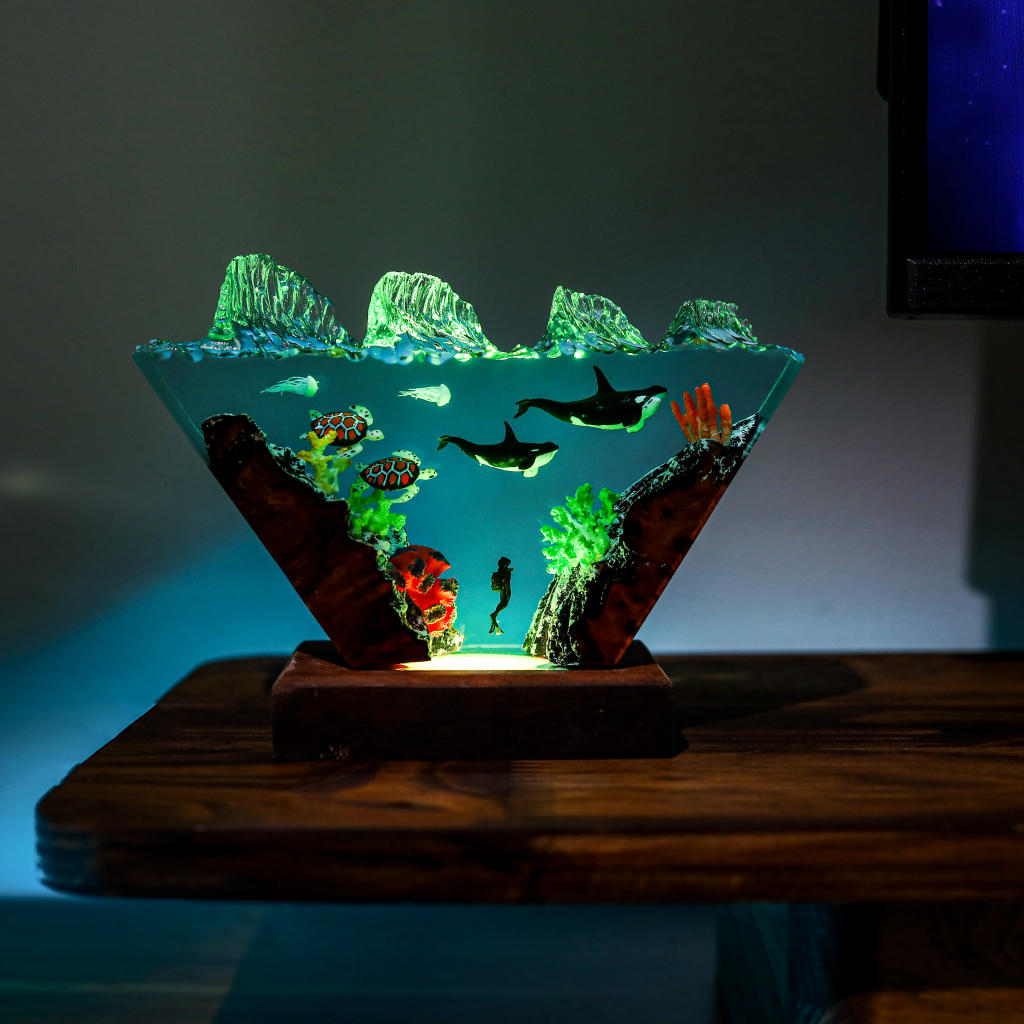 Imagine the majestic Orca and the graceful Sea Turtle swimming together through a peaceful oceanic world. This lamp brings that serene scene to life, with every little detail – from the tiny fish to the swaying seaweed and delicate corals, all meticulously sculpted and hand-painted by skilled artisans. It feels as if you’ve captured a real piece of the ocean in your home, creating a peaceful, soothing atmosphere that transports you to the heart of the sea.